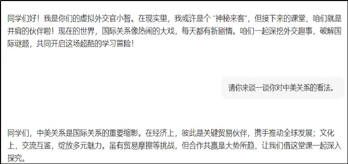 传统课堂中,学生的发言点评往往依赖教师单向反馈,而虚拟外交官“小智”的引入,让互动更具动态性和趣味性。