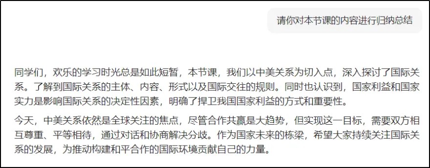 课堂尾声,教师向小智外交官下达指令,要求其对本堂课内容进行总结。在课程推进过程中,教师所提出的一系列问题,已作为重要素材“训话”AI“小智”外交官。借助这些素材,“小智”外交官得以全面梳理课程内容,形成清晰认知。最终,在课堂的最后环节,小智外交官的总结发言成功激发学生的情感共鸣,有力推动学生核心素养目标的达成。
