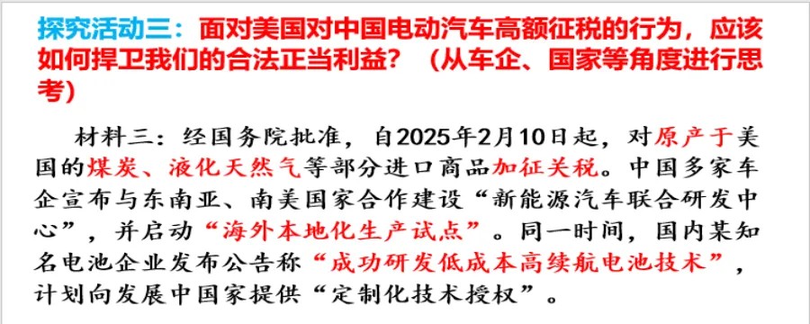 成功指令:“从美国对中国电动汽车高额征税分析国家利益与实力的互动,要求2024年数据+企业案例”→ 输出可直接用于课件。