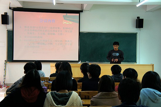 首先由刘晓苑书记介绍此次会议的主要内容:党日活动的通知,从9名正式党员中推选系部“示范党员”,和关于12月转正的5名预备党员转正会议的讨论。