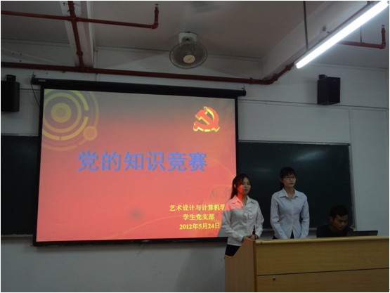 为了迎接党的十八大的召开,加深我学部学生对党史知识的了解,提高同学们的入党积极性。于2012年5月24日晚7点,在3号楼302我艺术设计与计算机学部学生党支部特意举办了以党史回顾为主要内容的知识竞赛活动,从而在同学们中营造爱党爱国、创先争优的良好氛围,进一步加强对学生党员教育,加深学生对党的认识。