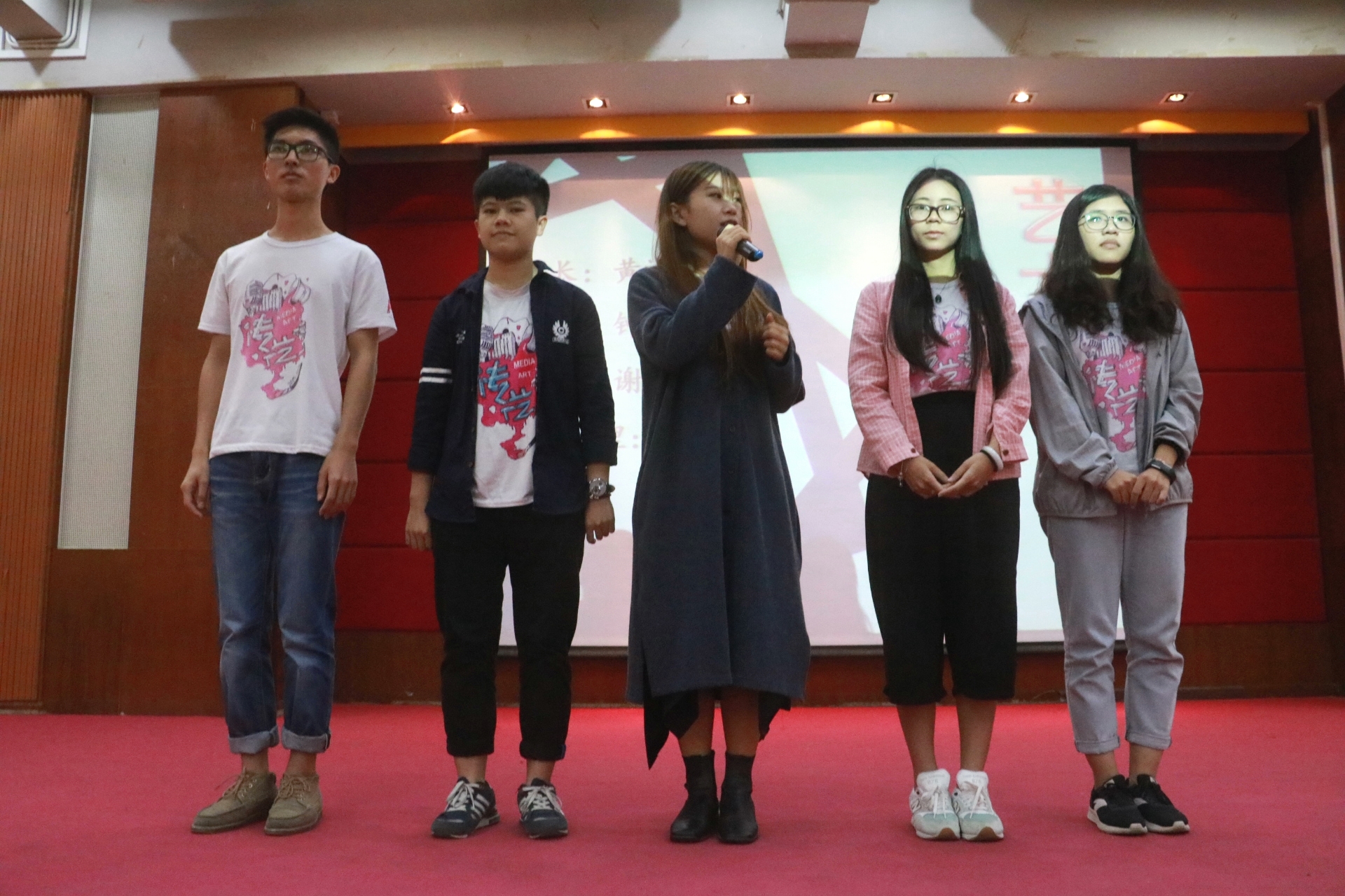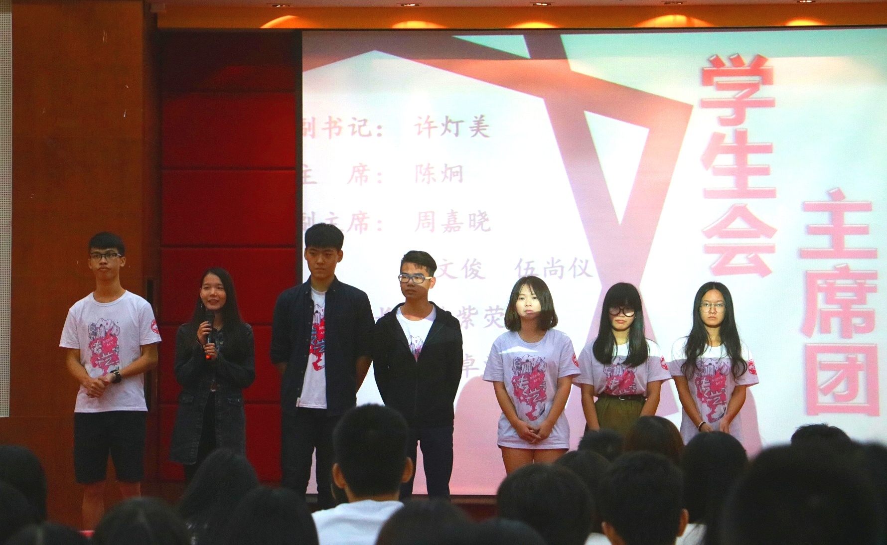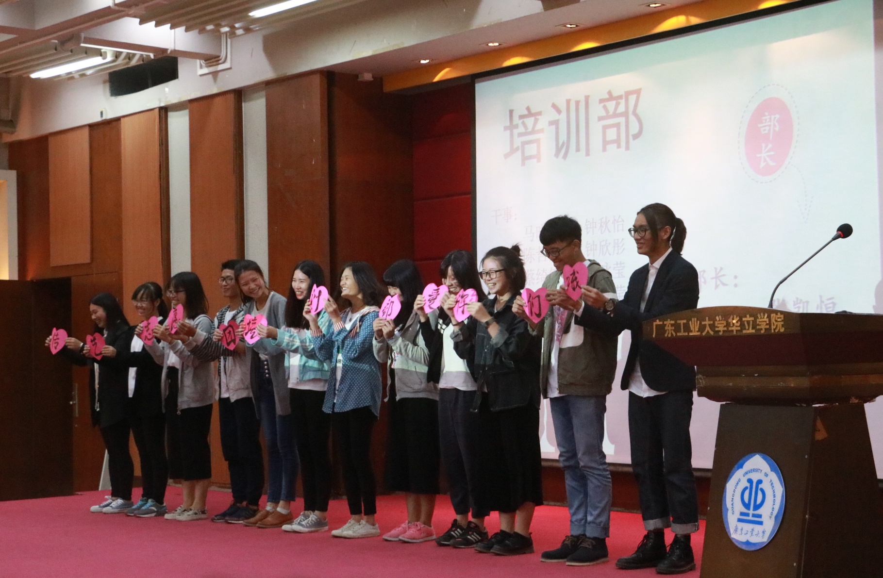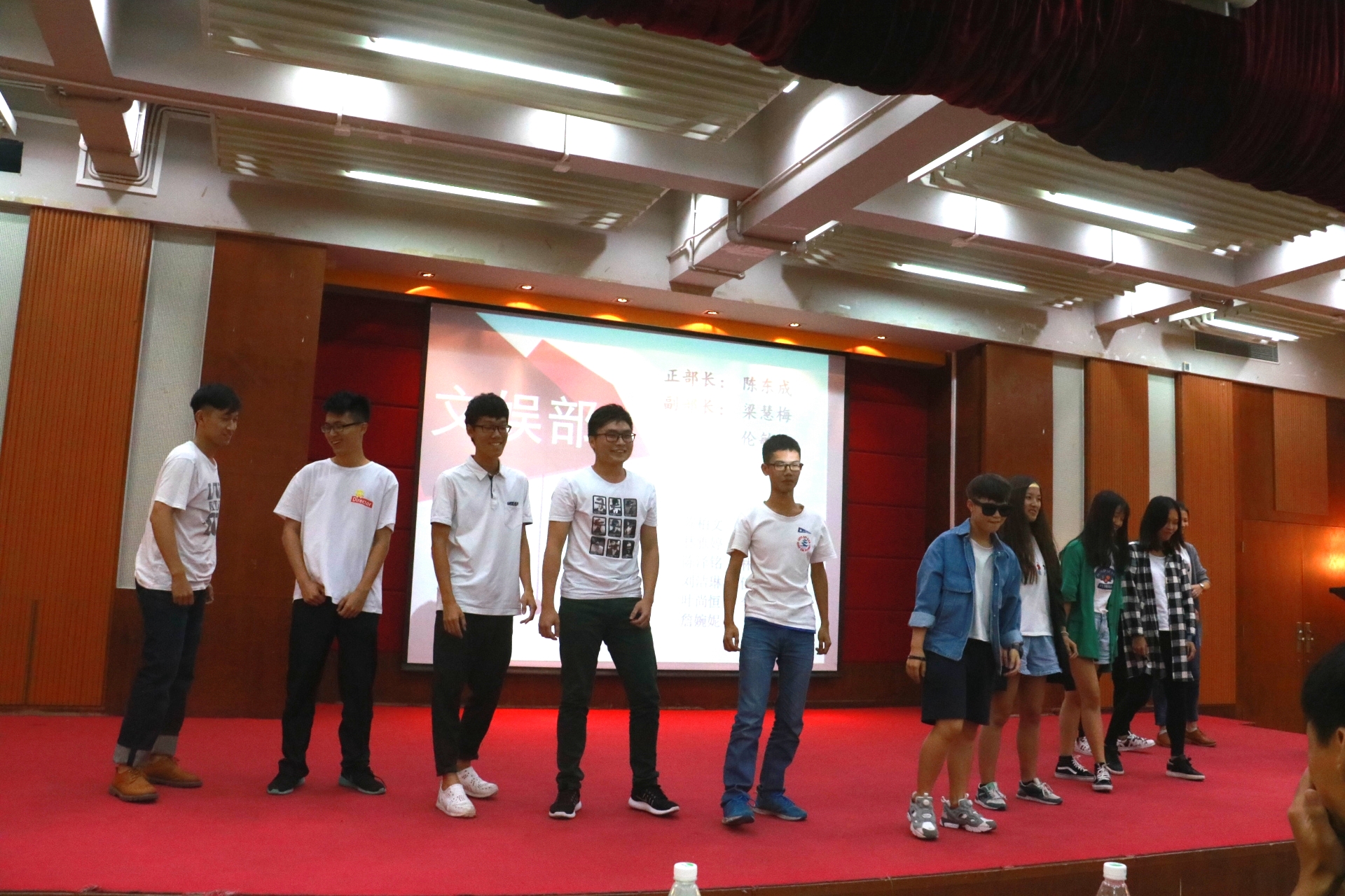 紧接着,由学生会各部门部长,艺术团各队队长和志愿团各部门部长带领新干事、新队员分别上台做自我介绍,各部门、队伍的介绍都具有风格,他们独具一格的出场和表演活跃了会场的气氛。