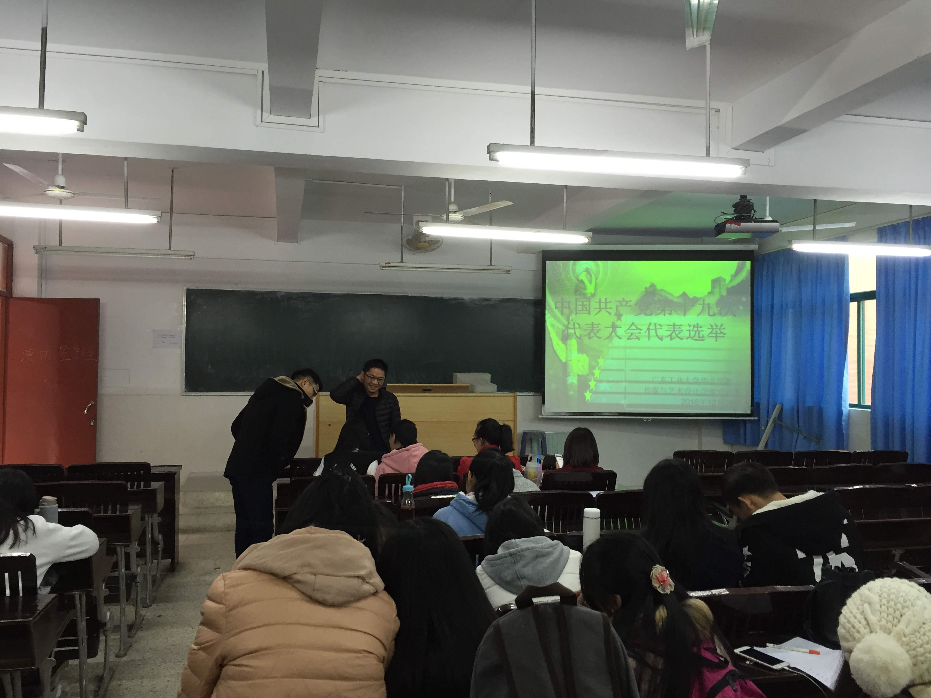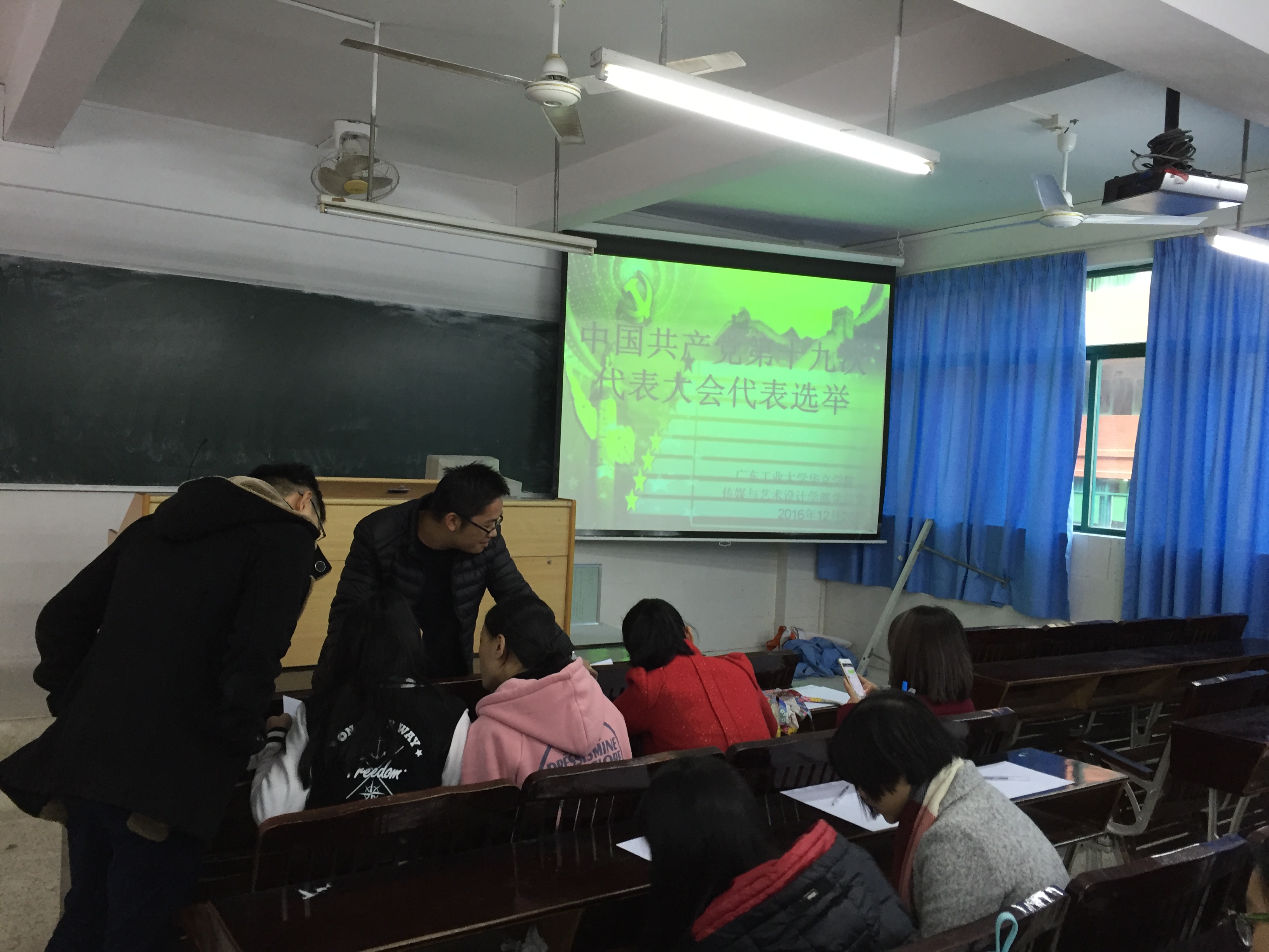 2016年12月28日下午4时40分,传艺学部党总支全体党员在1-201教室召开中国共产党第十九次代表大会选举。选举工作由传艺党总支书记黄叔贤指导。