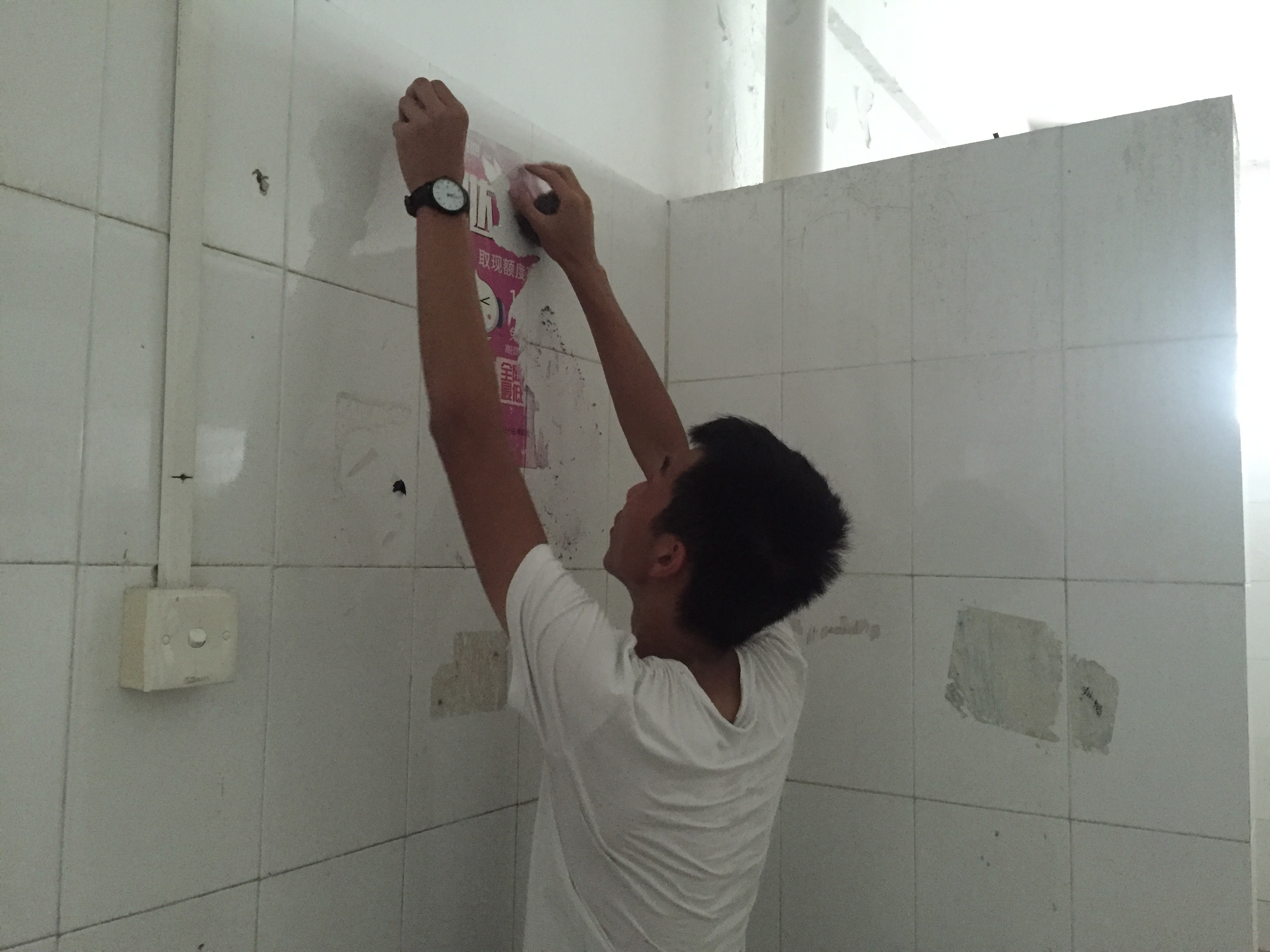 宣传部负责清理第8层的广告贴,培训部负责清理第7层的广告贴,活动部负责清理第6层的广告贴。各部门分工合作,互帮互助,不仅清洁效率高,清理程度也高。