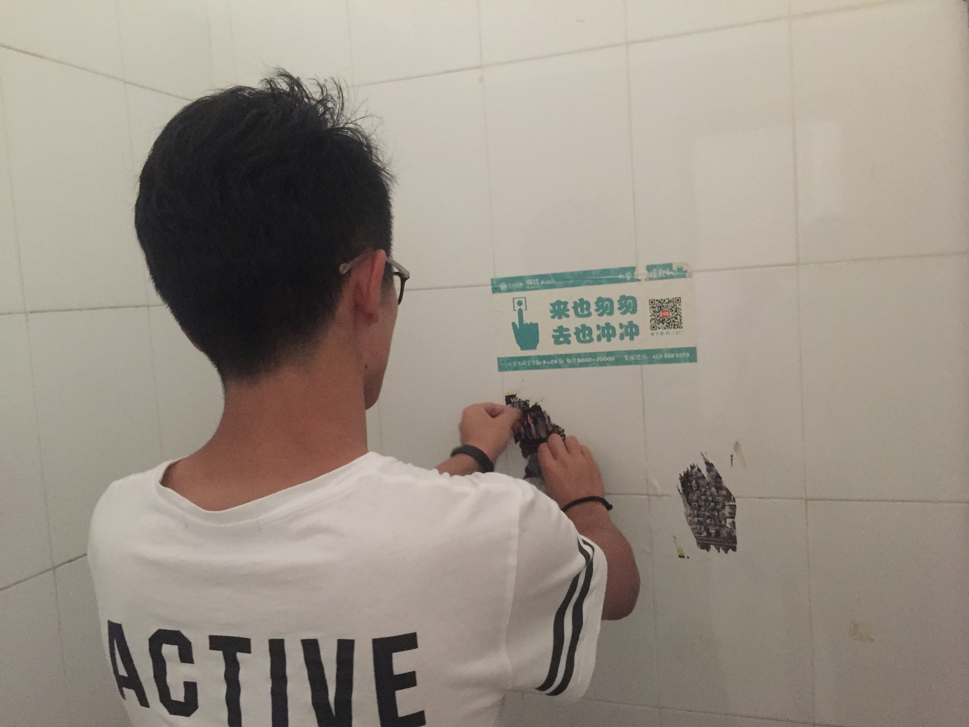 6点45分,广告贴纸几乎清理完毕。志愿团的撕楼贴活动,让综合楼的墙面焕然一新,为美化校园做出了一份贡献。
