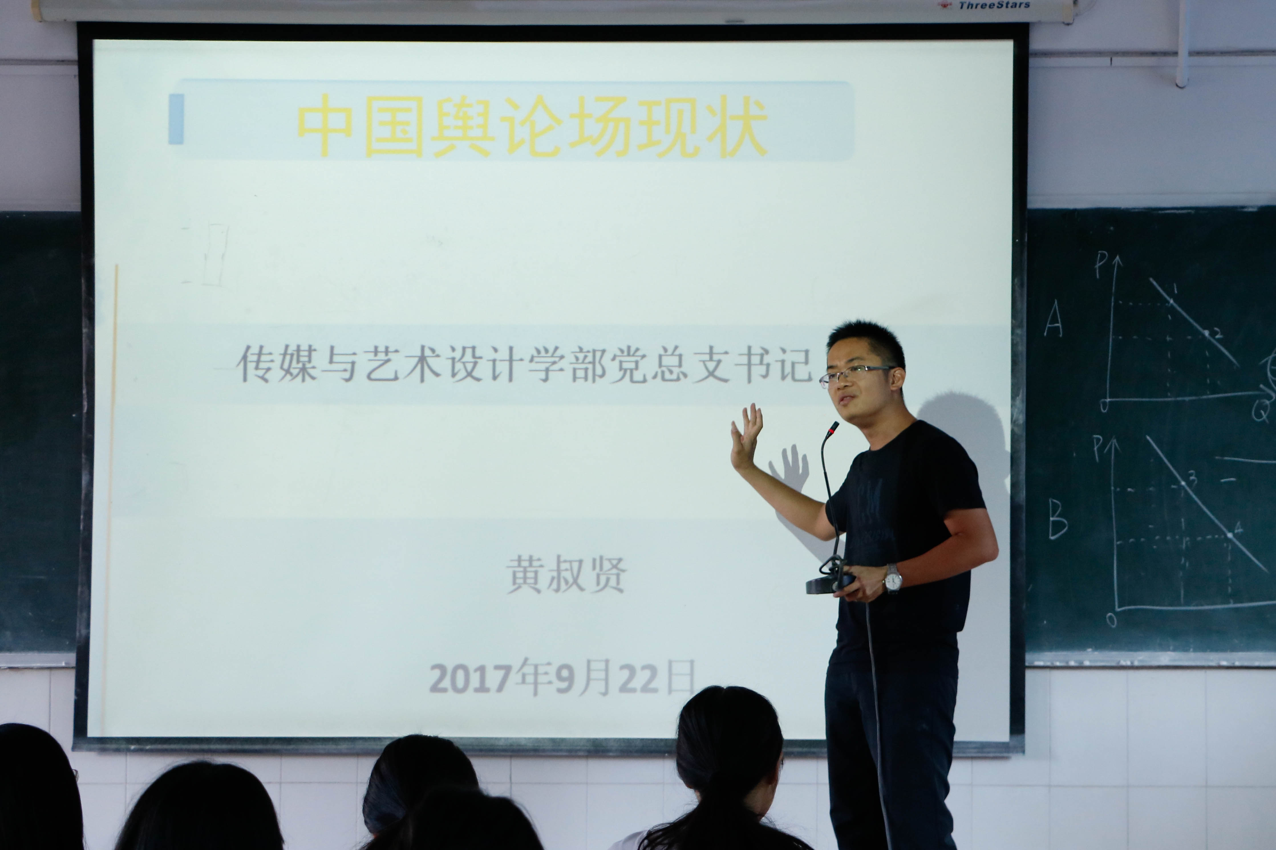 9月22日下午,我传媒与艺术设计学部在1号楼602进行了思政课第一讲《中国舆论场现状》。邀请了黄叔贤书记为学部相关专业的学生进行讲解。