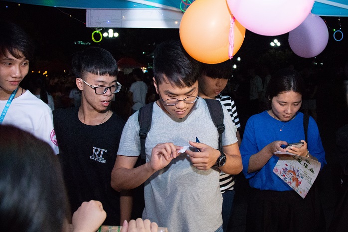 最后,参加晚会的各个班级派代表依次上台表演,为自己班级的摊位进行拉票。