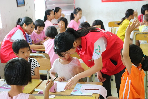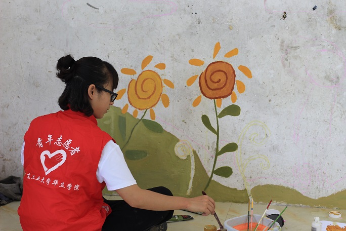 义教组准备了绘画、书法、唱歌、折纸等课程;墙绘组在校门处装饰着学校,给学校的走廊处增添了生趣。