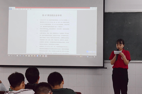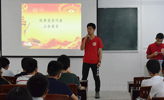 首先,由学生党员区永钊上台发言,他提到入党的经历,同学们一定要持之以恒,一定要牢记入党初心,要有理想信念,党校考试一定要认真对待,绝对不能出现迟到、旷课、考试作弊等违纪情况,同时也分享了自己入党心得,以及在党校中的所学所得。