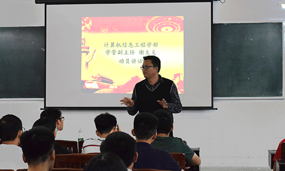 最后,计算机信息学部学管副主任谢太义上台动员,他首先肯定了此次党校学员们的努力,同时给出了自己的期望,期望学员们能够成为优秀和进步的代表,多了解时下的中国和共产党,坚定信念,确立目标并努力奋斗,同时能好好珍惜本次党校培训,并顺利通过考试。