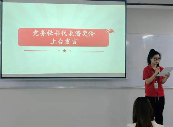 接着,党务秘书代表潘奕伶上台进行发言。她首先由衷地感谢了学院老师对党务工作的指导与支持,接着他对过去一学年的党务工作进行了简要的汇报,表示会在今后的日子里继续挥洒青春与汗水,不忘初心、砥砺前行,继续为学院的党建工作奉献力量!