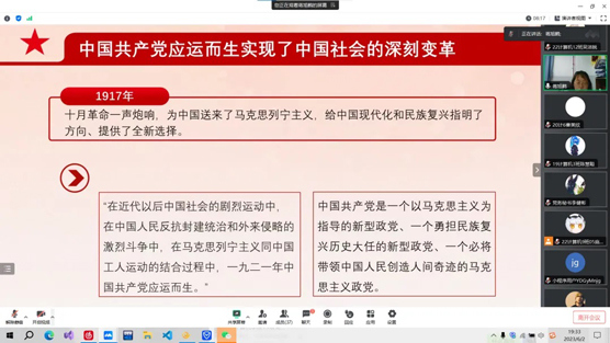 此次线上党课以三部分开展,分别是“中国共产党应运而生实现了中国社会的深刻变革”、“中国共产党领导中国特色社会主义发展了中国”和“新时代中国特色社会主义的伟大成就也是在党的领导下取得的”。授课老师以这三点充分证明了中国共产党团结带领人民进行的建设中国特色社会主义新的伟大实践,使中国大踏步赶上了时代,实现了中华民族从站起来到富起来的伟大飞跃。只有中国特色社会主义才能发展中国。