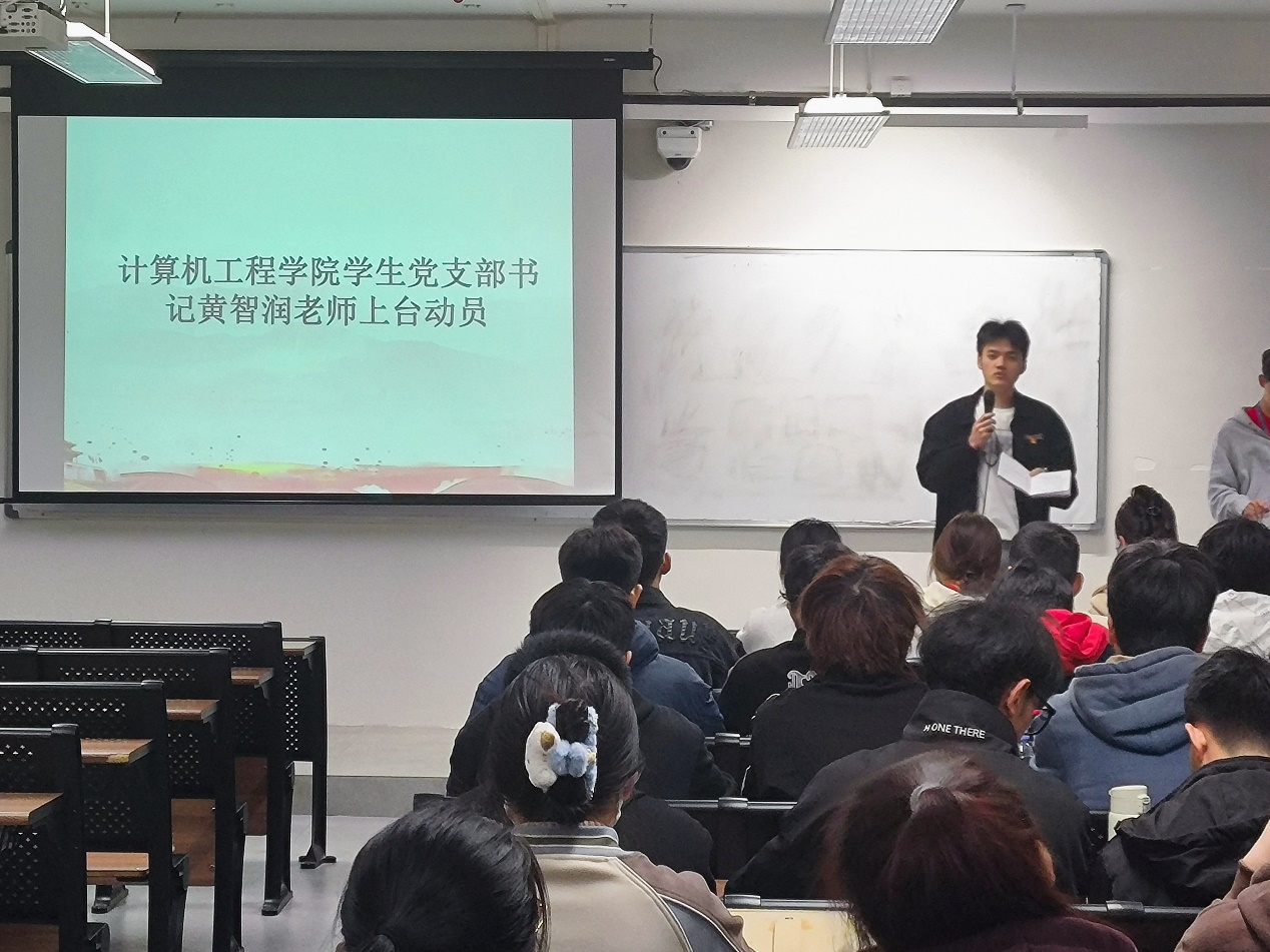 会议开始,由计算机工程学院学生党支部书记黄智润老师上台发言:我们的目标不仅是学习党的理论和政策,更重要的是将这些知识转化为实际行动,以更加饱满的热情投身到学习和工作中,以实际行动践行党的宗旨。我希望通过这次大会,能够激发出每一位党员的先锋模范作用,引领和带动更多人为实现社会主义现代化强国而不懈奋斗。在这个春意盎然的季节,让我们以党课动员大会为新的起点,以党的光辉历程为镜,以党的创新理论为指引,共同书写新时代的华章,共筑理想之光,照亮前行的道路。