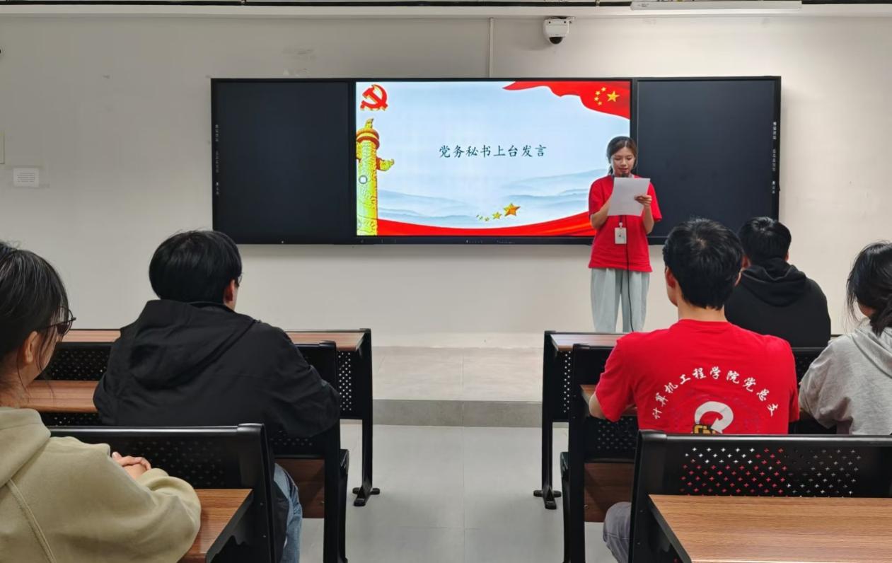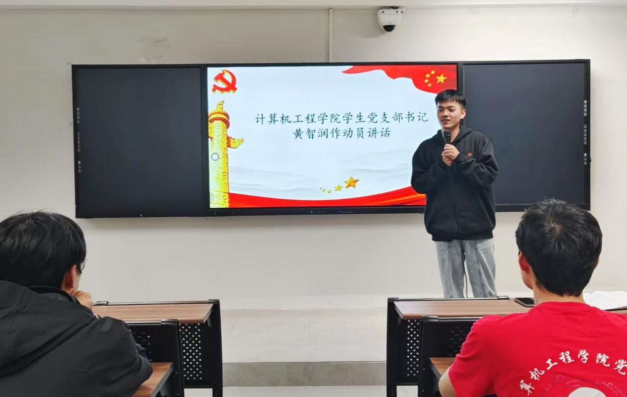 会议伊始,计算机工程学院学生党支部书记黄智润上台进行动员讲话:参加党校培训的目的是提高各位入党积极分子的思想政治素养,加强理论学习,深入理解党的创新理论,掌握习近平新时代中国特色社会主义思想,为推动党和国家事业发展提供坚实的理论支撑。同时希望参加党校培训的学员们强化党性修养,提升党性觉悟,做到坚定信念、严守纪律,增强“四个意识,把培训过程转化为提高政治觉悟和工作能力的过程,争取早日加入中国共产党。