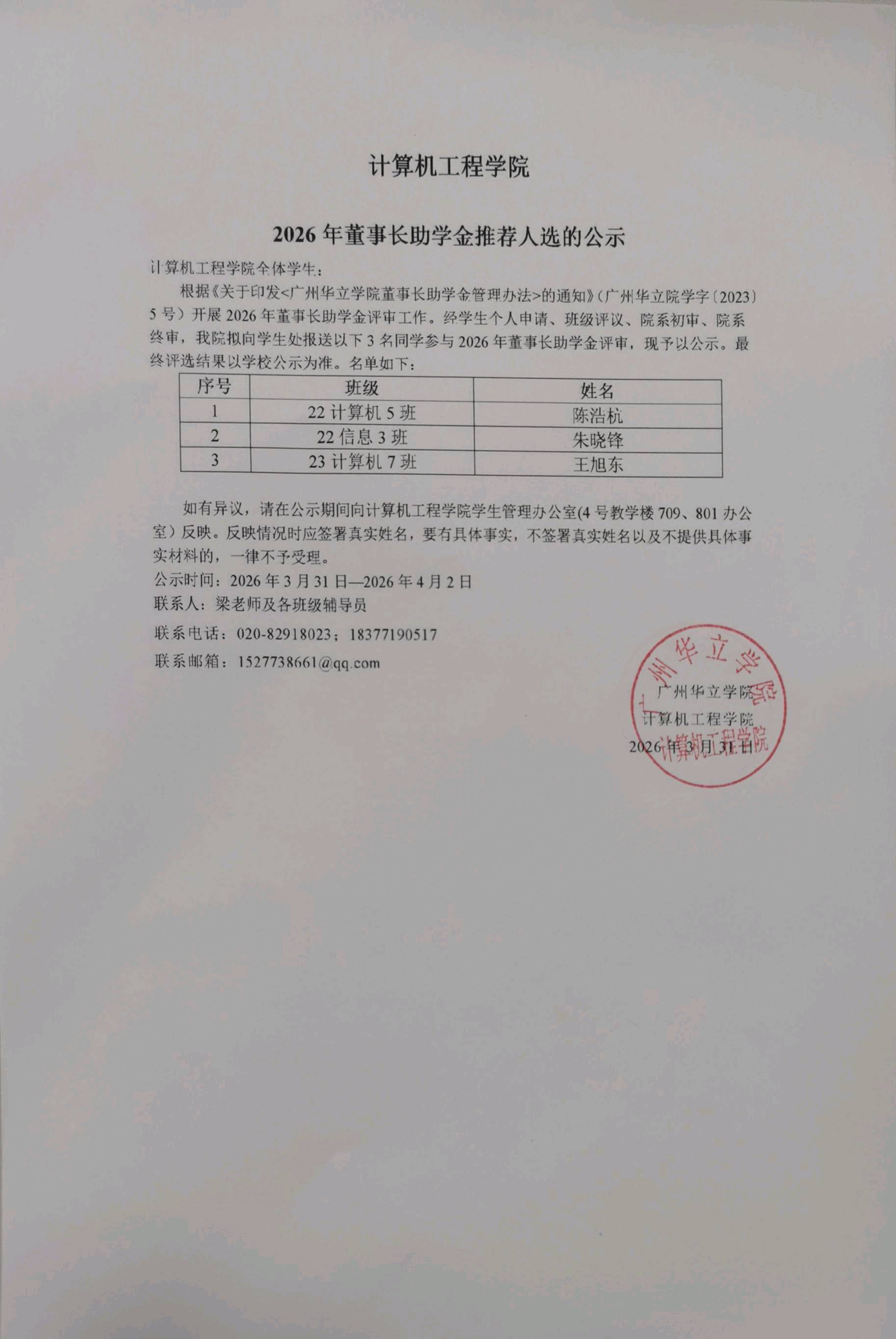 计算机工程学院2026年董事长助学金推荐人选的公示