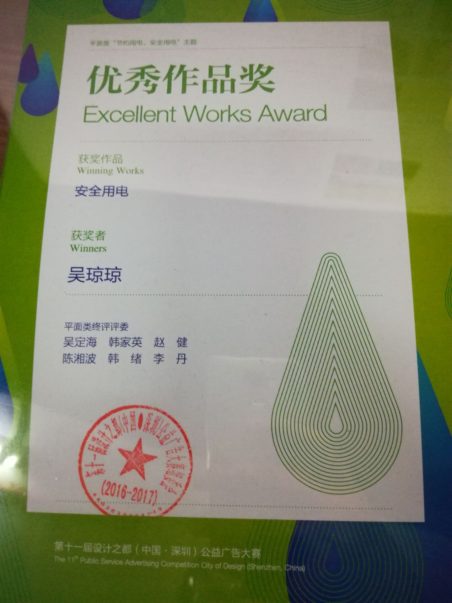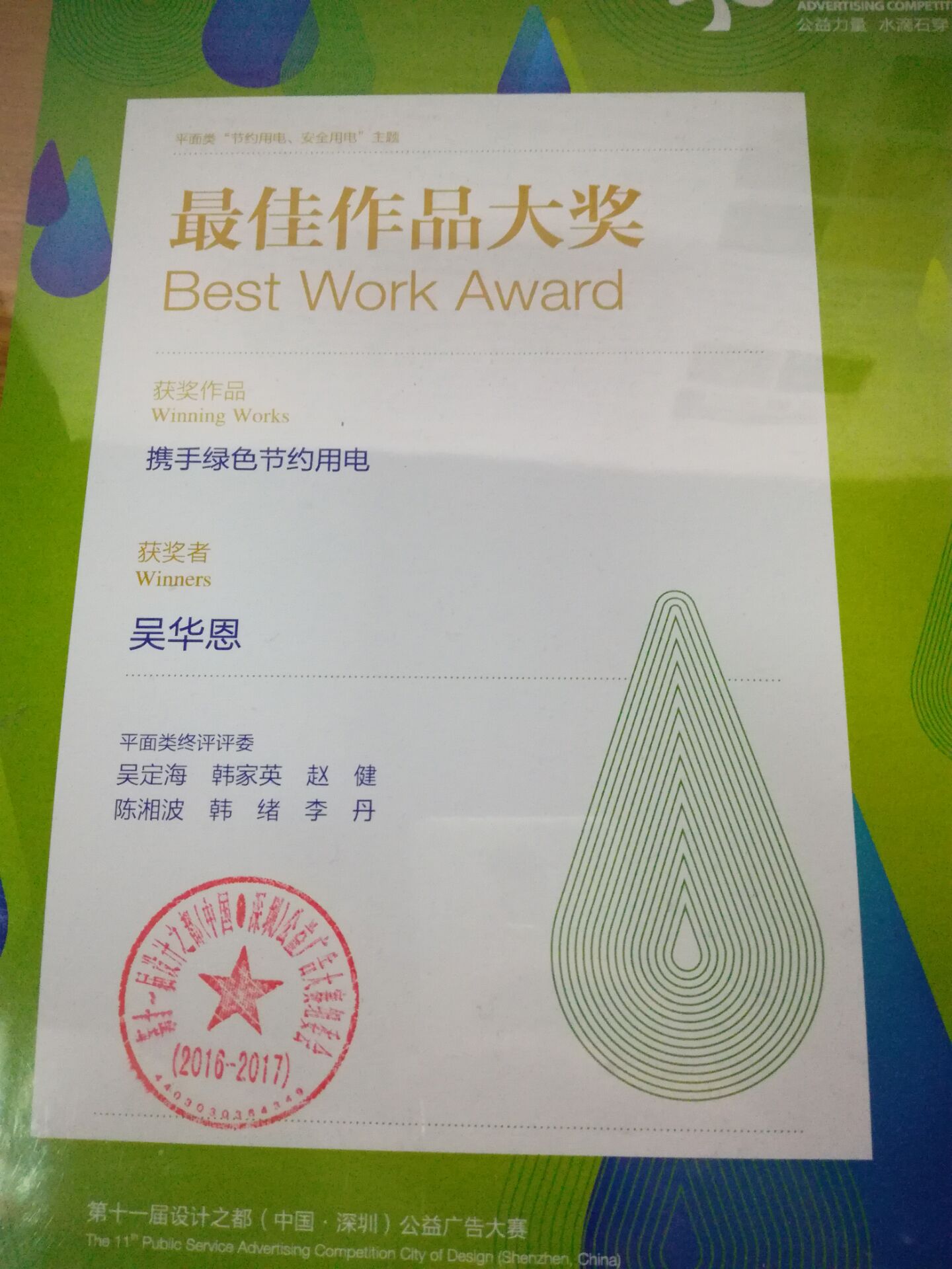 12月8日下午,第十一届设计之都(中国•深圳)公益广告大赛颁奖仪式在深圳广电集团举行。我学部的吴华恩和吴琼琼同学分别荣获“最佳作品大奖”和“优秀奖”。