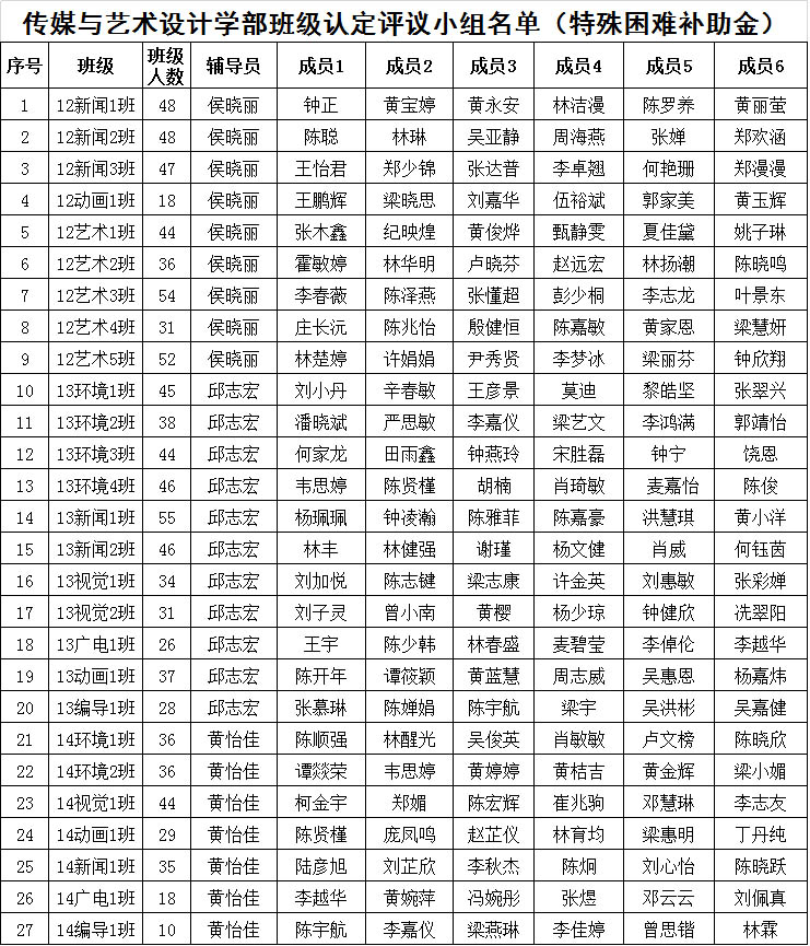 关于学部特殊困难补助金班级认定评议小组成员名单的公示