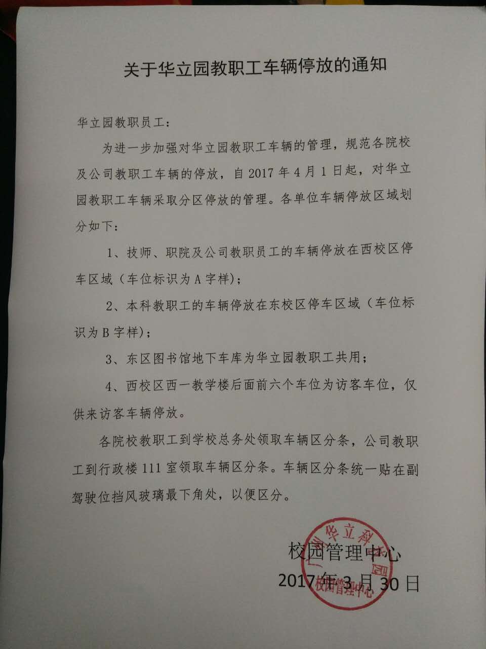 关于华立园教职工车辆停放的通知