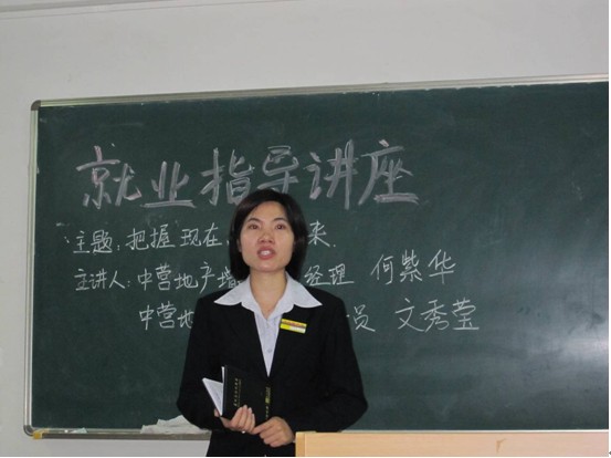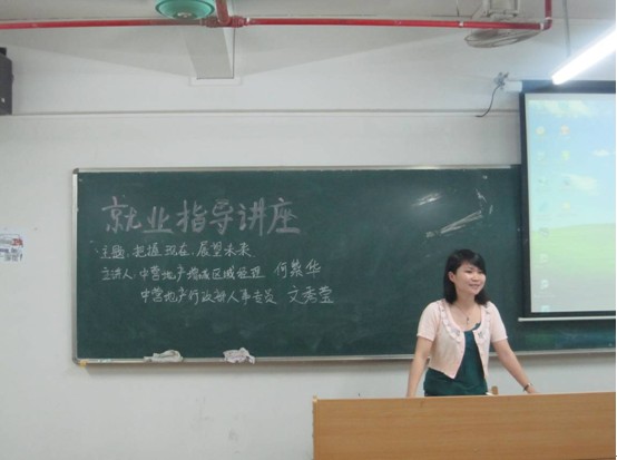 面对日趋严峻的就业形势,为了提升大学生的综合素质,更好地帮助学生顺利走上工作岗。5月10日下午,计算机与艺术设计学部本着服务学生、解决学生就业时所遇到的问题的初衷,特邀中营地产增城市分区的资深 人员在5号楼507举办了主题为“把握现在,展望将来”的教育讲座。