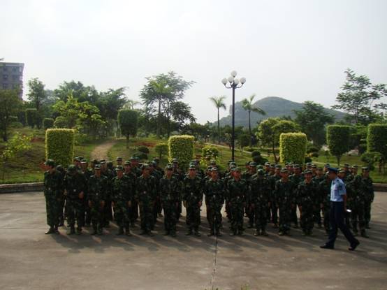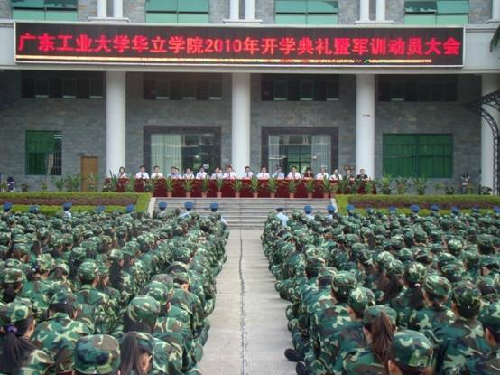9月20日下午,天空阴沉,细雨纷飞,广东工业大学华立学院在综合楼广场隆重举行2010级新生军训阅兵暨总结表彰大会。在各位领导、嘉宾和广大师生的注目下,4000多名身穿迷彩服的2010级新生在阴雨中迈着整齐的步伐,喊着嘹亮的口号,英姿飒爽,精神抖擞,他们标准规范的动作,威猛刚劲的军体拳,引发了大家一次次如潮般的掌声。传媒与艺术学部分列式方队获得“军训精神文明先进连”称号。我学部各班的学生方队在各个教官的带领下光荣地接受了学院领导的检阅。
