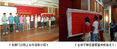 会上,王锦秀书记启动“争做文明大学生”宣誓仪式。各位领导嘉宾见证我部学生代表的宣誓过程并签名留念。紧接着,我学部主席团以及我系学生会各部门进行了自我介绍,各部门出色的自我介绍赢得了与会者的阵阵掌声。