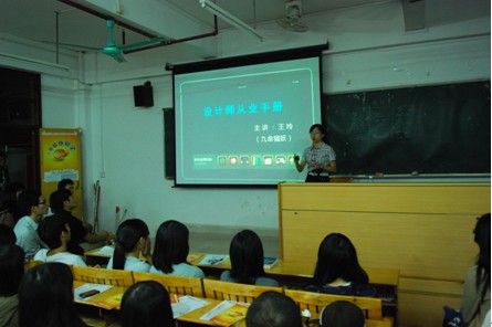 另一名讲师是杨亚东,她用案例分析了如何是一个成功的广告设计,制作一个成功的广告设计需要运用夸张的手法使之吸引眼球,要求设计师有丰富的想象力和创造力,要有逆向思维。告诉我们的就业方向和发展前景。