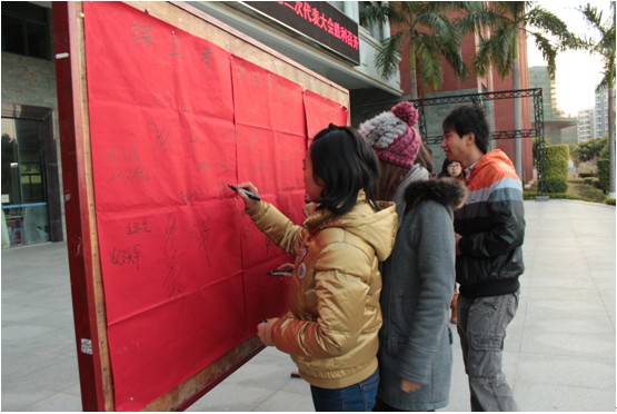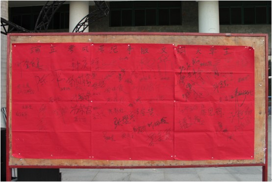 宣誓结束后还有学生代表上台在诚信考试承诺公告栏上签名。