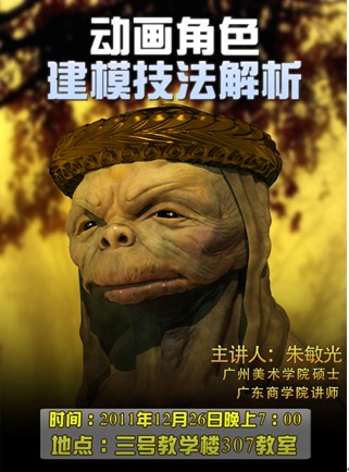 2011年12月26日19:00,艺术设计与计算机学部三维动画讲座在3-307举行。此次讲座由广东美术学院三维动画硕士、广东商学院讲师朱敏光主讲。艺术设计与计算机学部艺术类专业的学生参与了此次讲座。