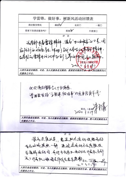 本次活动,得到了领导和老师的一致好评。朱木清、程东胜等老师还在回馈表中的“清洁服务情况”写上了满意的评价。老师们的笑容给予了同学莫大的鼓励,同学们表示,今后将继续坚持“学雷锋,树新风”的精神,参与到各类志愿活动中去。