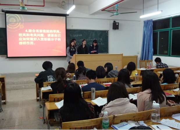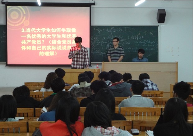 随后,学员们进行了热烈的分组专题讨论,讨论会上学员们各抒己见,分别对:1、谈谈自己对党的认识(历史、理论、方针、政策等),分析大学生为何应积极要求入党(剖析入党动机)。2、党员发展的程序和手续有哪些?3、当代大学生如何争取做一名优秀的大学生和优秀共产党员?(结合党员条件和自己的实际说说自己的理解)。4、结合当前我院的学风、校风和考风问题,谈谈自己应如何做好入党积极分子的榜样作用。这四个主题进行探讨。