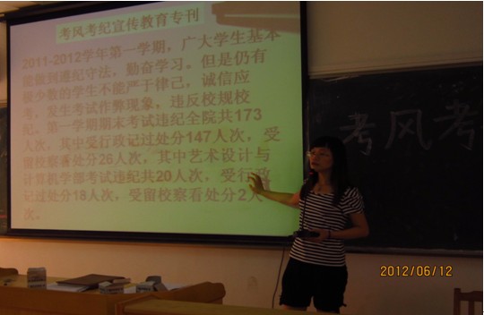 2012年6月12日16:00,艺术设计与计算机学部考风考纪动员会议在3-303召开,会议由学部党支部书记刘晓苑主持,参加此次会议的有各班的班长、心理委员、团支书等主要学生干部。