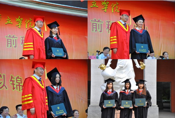 最后,毕业典礼进入高潮阶段,伴随着欢快的音乐和热烈的掌声,章云院长为我院优秀毕业生代表颁发学士学位证书,章院长亲切地和每一位优秀毕业生代表握手,用手轻轻地把同学们学士帽上的流苏从右边拨到左边,并对同学们表达了诚挚的祝福。