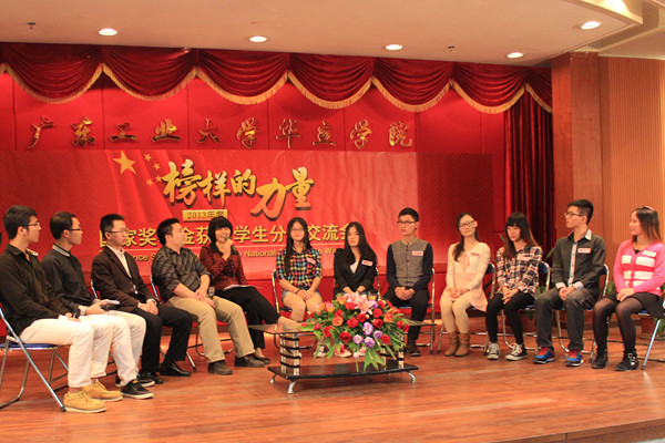 “当你感到越忙越累的时候,就是你收获最多的时候!”“背着双肩包去图书馆,并不土,因为背负的是梦想,坚持晨读暮跑,并不傻,因为这是对梦的坚持。” 11月21日晚,学院在二号报告厅隆重举行“2013年度‘榜样的力量’国家奖学金获奖学生分享交流会”。国家奖学金获奖学生代表谭慧娴、黎允乐、方艳、廖婉烨、邱瑞俊、江慧君、奚克璇等同学分别通过成长感悟分享、主持人访谈、互动交流等方式与全院近400名学生分享交流追寻梦想的故事。学院党委书记王锦秀及相关部门负责人出席了本次活动。