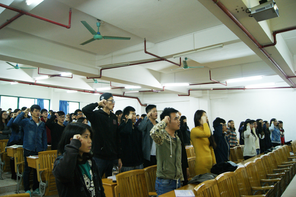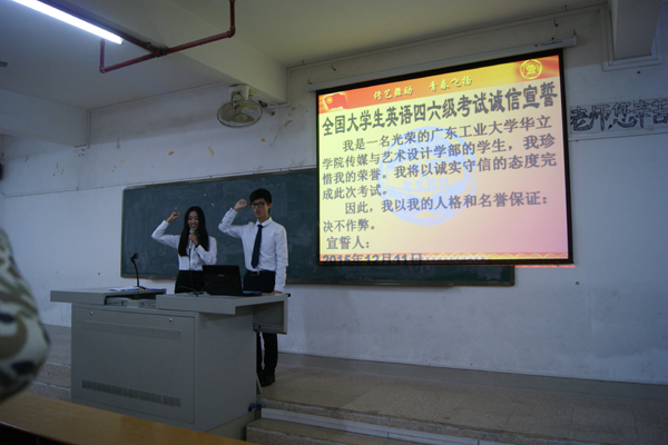 随后,在主持人的带领下,在场的同学作全国大学生英语四六级诚信考试宣誓,保证在考试中绝不作弊。