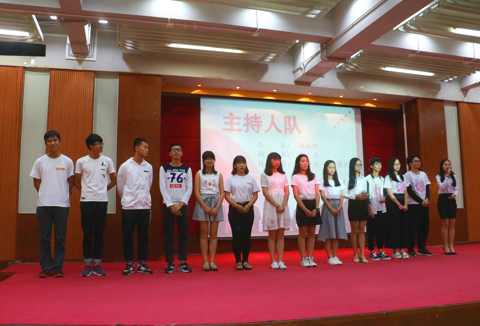 紧接着,由学生会各部门部长,艺术团各队队长和志愿团各部门部长带领新干事、新队员分别上台做自我介绍,各部门、队伍的介绍都具有风格,他们独具一格的出场和表演活跃了会场的气氛。