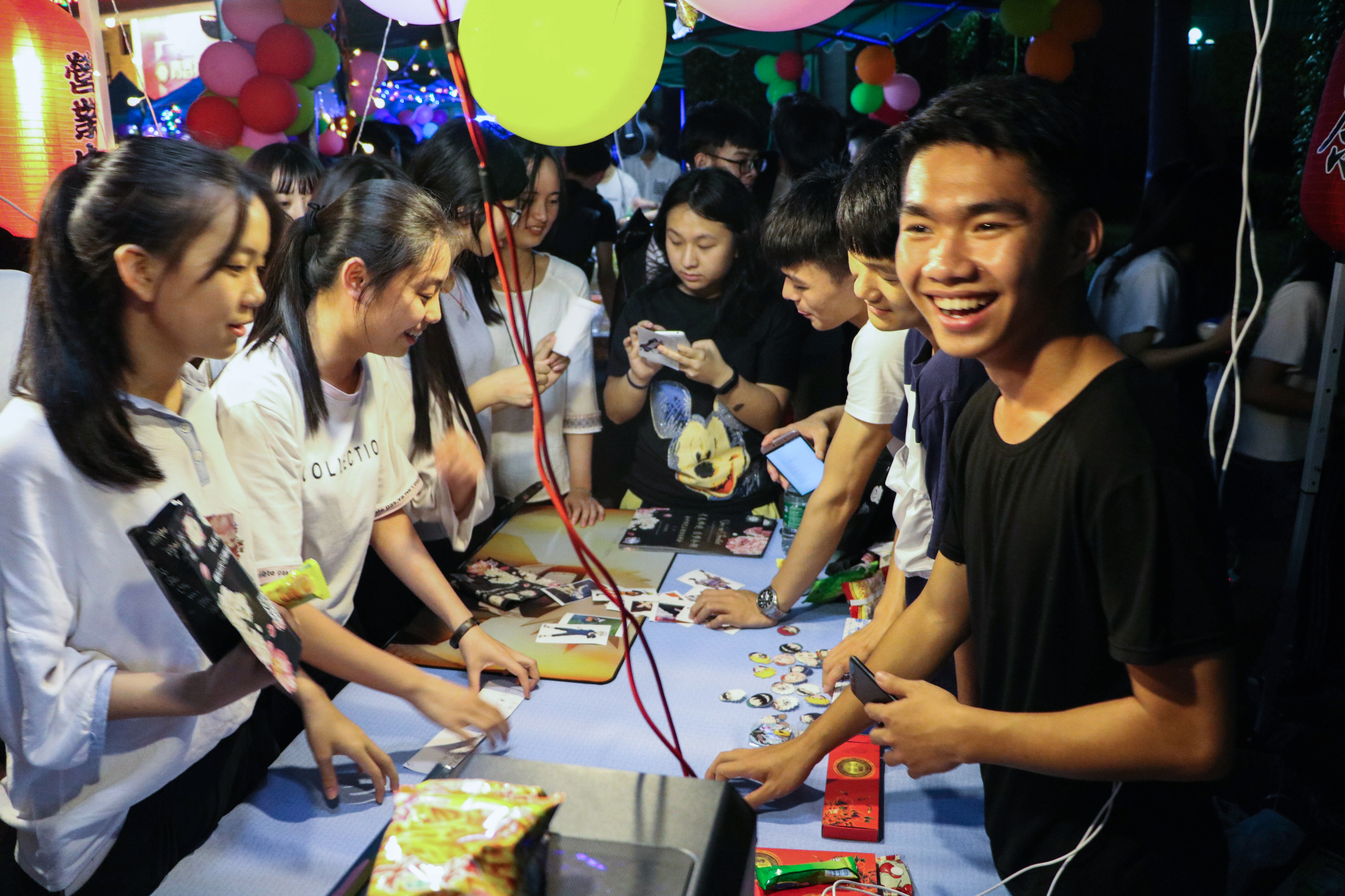 最后,参加晚会的各个班级的同学们依次上台表演,为自己班级的摊位进行拉票。