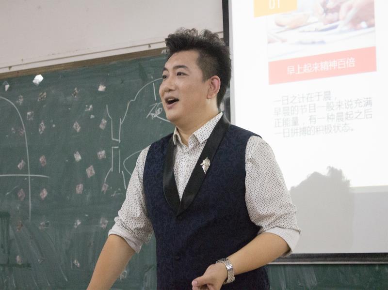 讲座开始,林海老师就用他自身自带的幽默感以及激情让全场学生沸腾起来。并开始向同学们分享播音主持是什么。