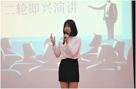 比赛正式开始,第一轮的主题是“朋友圈”,10位选手用他们的聪明才智和见识理解去向观众评委们诠释他们眼里的“朋友圈“,博得观众阵阵掌声。特别是7号选手王泽宇同学和8号选手李桥菲同学分别选用了文言文和歌唱作为自己的自我介绍,演讲十分精彩。