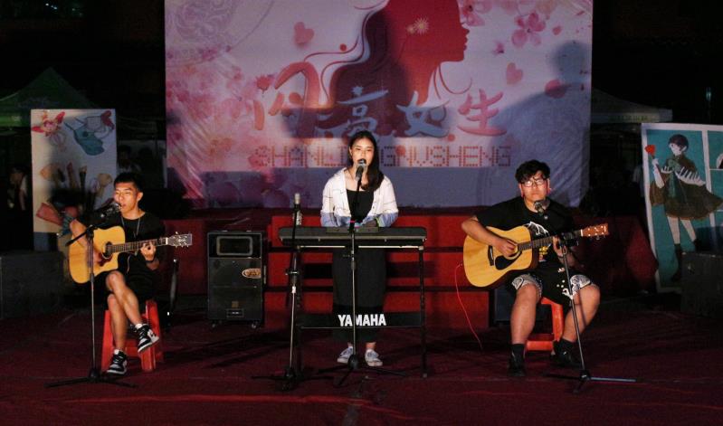 首先,由声乐队带来表演《一起摇摆》劲爆开场。男生们带来一首小虎队的《青苹果乐园》,轻快的歌声、挥舞的双手、炫彩的光线,让现场的大家都不自觉地跟着歌声摇摆律动。三位女生带来充满青春活力的《superstar》,S.H.E可以说是极具代表性的女子组合,很好地切合了本次比赛的主题。声乐队为本次比赛开了一个完美的头。