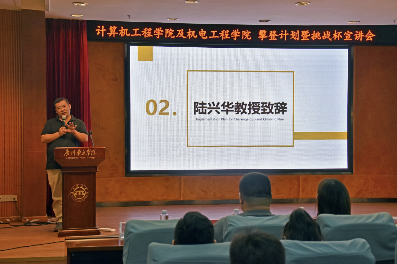 广州华立学院教务处处长陆兴华教授,讲述了挑战杯和攀登计划对年轻一代的创新创业的历程中所起的推动作用,以其学生的项目水稻生长情况及特性检测为例,进行了详尽的阐述,深度解析了项目的实践应用、层次经济价值,以及目标受众的实际认知与接纳能力。陆教授借此清晰地勾勒出比赛的整体思路和核心细节,为同学们提供了简明扼要而又深刻的宝贵经验和建议。