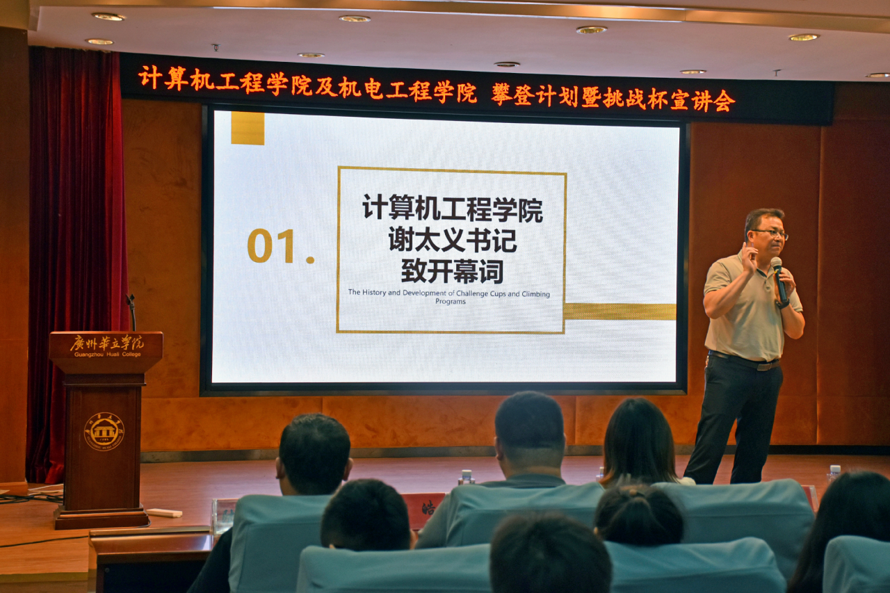 计算机工程学院党总支书记谢太义致开幕词,鼓励大家积极参与挑战杯与攀登计划,每次参与都是一次成长的机会,每次挑战都是一次提升自我能力的机会,并对同学们寄予深切厚望,希望同学们希望同学们能把握这个机会,从挑战中成长,学会合作,学会分享,学会学习。