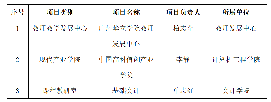 根据《关于开展2023年度校级教学质量与教学改革工程项目申报推荐工作的通知》要求,各单位结合学校创新强校建设规划按要求推荐了校级质量工程申报项目。经二级学院推荐,专家评审投票,共评选出3个质量工程项目予以立项,名单公示如下: