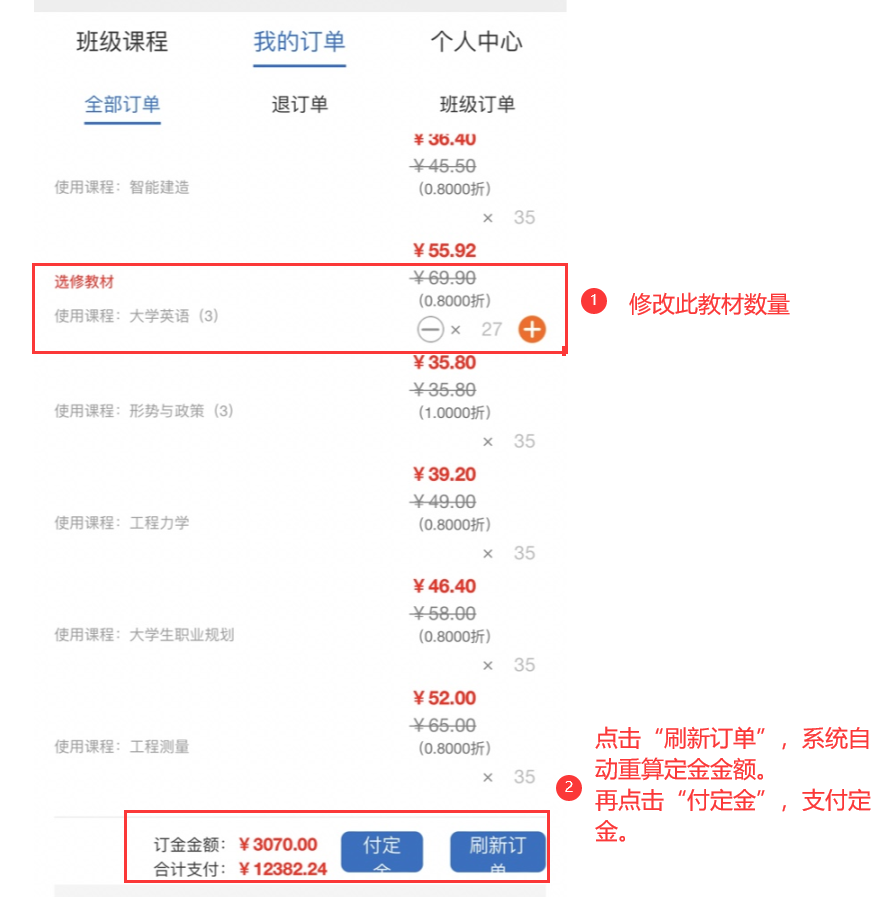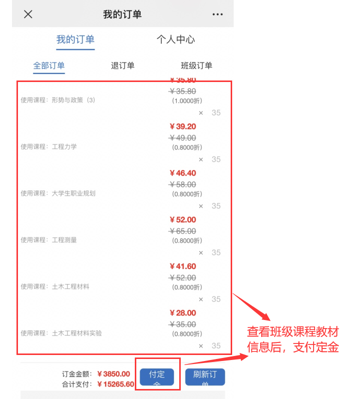 第四,返回“我的订单”,查看班级课程教材信息,并点击“付定金”进行定金支付。