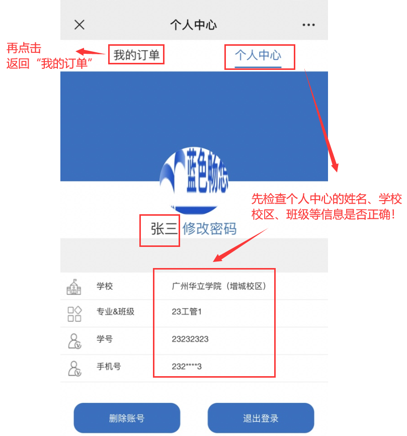 第三,登陆后请立即查看个人中心,检查本人姓名、学校校区、年级班级等信息是否准确。核实无误后,点击返回“我的订单”;