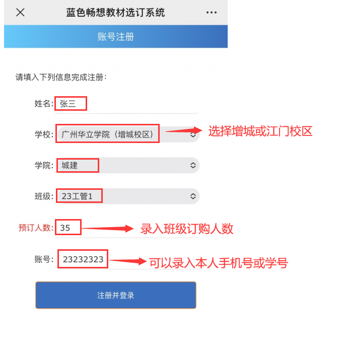 第二,选择正确的学校校区、学院、班级,输入预订数量,账号填写手机号或学号都可以(密码默认为账号后六位数),点击注册并登录;