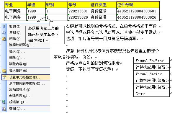 9、 报名表格里面的所有数字的格式要求全部使用文本格式,格式如下所示: