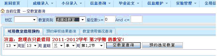 教室借用预约操作流程 作者:教务处 发布时间:2016-04-01 00:00:00 浏览次数: 次 【字体:小 大】 具体操作路径为:1.打开教务网页面,显示界面如下:2.登录之后,选择“信息查询”-“空教室” 输入需要预约教室的类别、周次,星期和节次,点击查询。3、查询之后将需要预约的教室在最后面显示“选定”选项勾上,然后点击 “预约选定教室”; 点击之后会填出一个页面,将借用单位、单位电话、个人电话和用途填写之后点击右下角的教室预约即可完成教室预约。 分享到: 【打印正文】