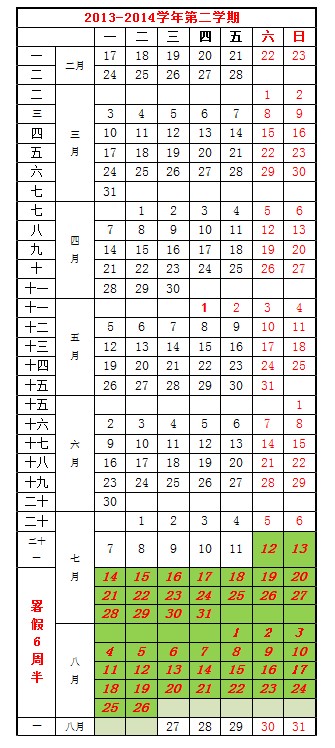 2013-2014学年第二学期校历 作者:教务处 发布时间:2014-01-05 00:00:00 浏览次数: 次 【字体:小 大】 注:1.学生缴费注册时间为2月15日、16日。 2.本学期2009建筑学、2010级(非建筑学专业)进行校外毕业设计或论文,2010建筑学、2011级、2012级及2013级教学周为21周(含2周考试周)。 分享到: 【打印正文】