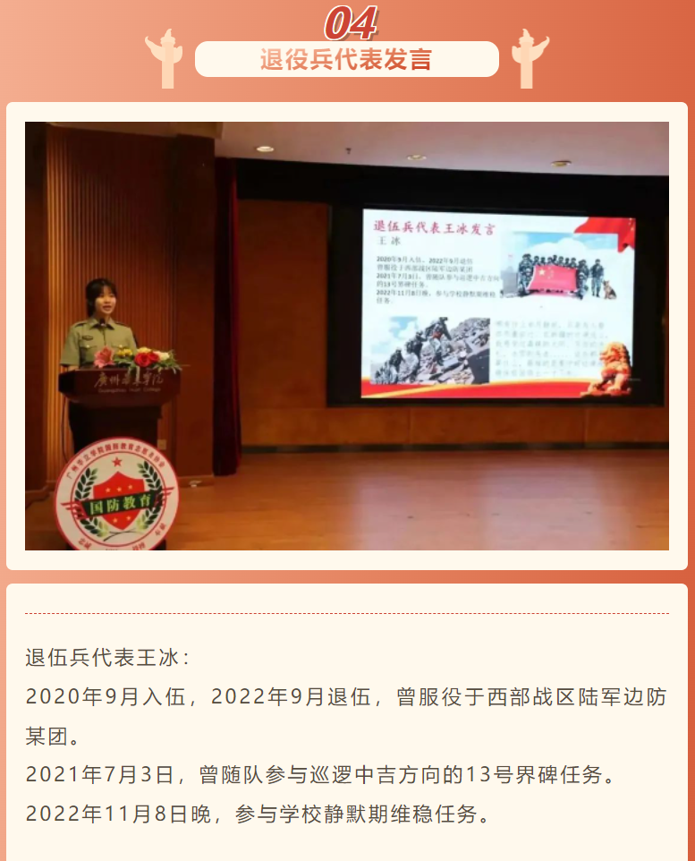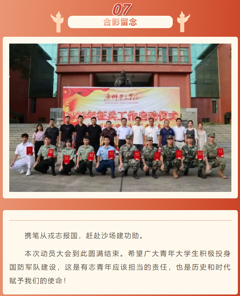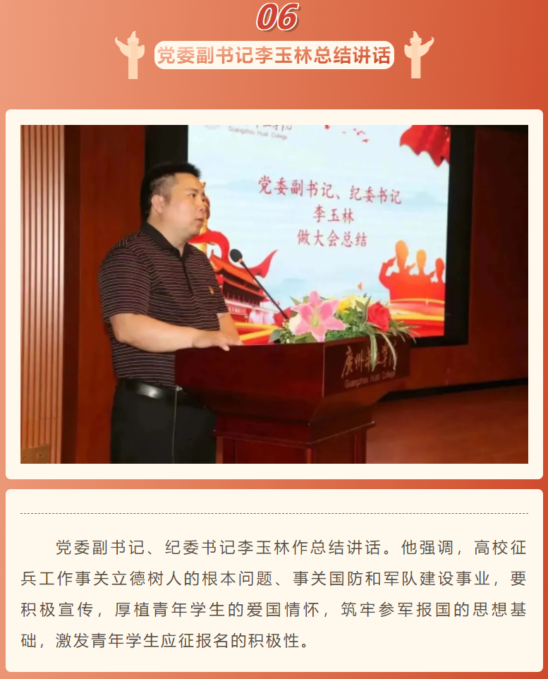 携笔从戎,无悔青春! 作者:广州华立学院 发布时间:2023-06-01 10:59:06 浏览次数: 次 【字体:小 大】 为积极响应国家征兵工作号召,做好大学生征兵宣传教育工作,帮助大学生了解征兵政策,鼓励大学生参军报名,建功军营。2023年5月31日下午4时,广州华立学院于图书馆二号报告厅开展征兵宣讲动员大会。出席会议的有广州华立学院党委书记李琼生,党委副书记、纪委书记李玉林,保卫处处长兼武装部部长林小龙,团委书记王韬,学生处副处长任佳,学生处副处长方壮英,保卫处人武科科长兼武装部副部长陈勇明。 终审:继续教育学院 分享到: 【打印正文】