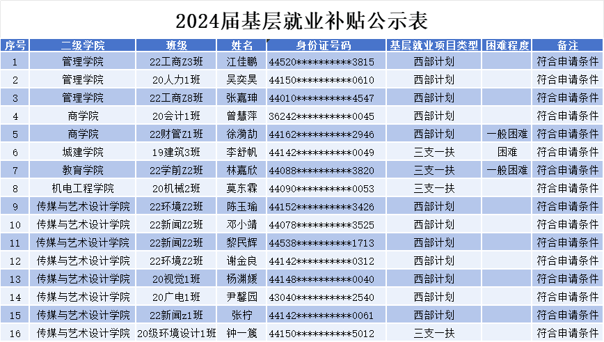 经二级学院审核并推送至就业指导中心,学校初步审核共16名同学符合申请条件,名单将于10月24日到28日在就业指导中心宣传栏及就业指导中心办网站公示五天,如有异议,请提供异议者有效证件到就业指导中心办公室(综合楼314)核查,具体公示名单如下。